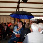 Obwohl Regen die Zeremonie behinderte, waren zahlreiche Besucher und die Presse erschienen, zweckmäßig halt mit Regenschirm, um der neuen Königin zu huldigen. Musikalisch aus Erich Keicher’s Garage heraus umrahmte dabei der Musikverein Erlenbach auch das Herablassen der Weinfestfahne. Das endgültige Aus für dieses Jahr wurde von Michaela Keicher fotografisch eingefangen.