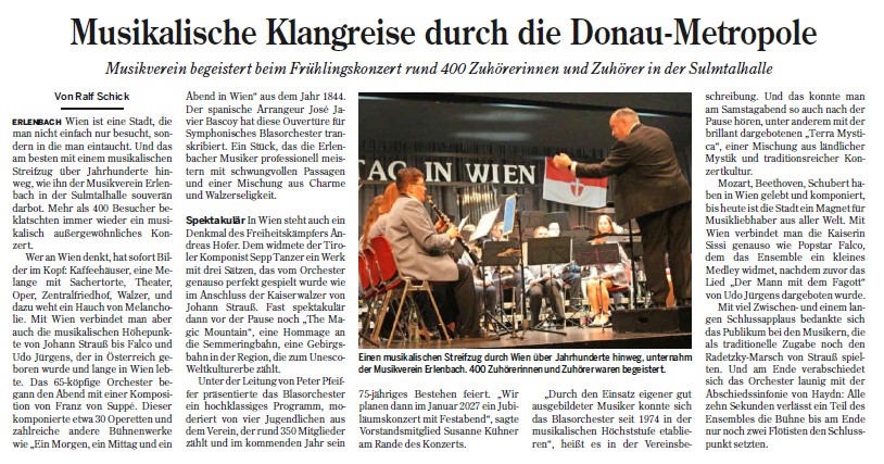 „Ein Tag in Wien“ – so lautete am vergangenen Samstag das Motto des Abends, zu dem wir unter der Leitung unseres Dirigenten Peter Pfeiffer zum diesjährigen Frühjahrskonzert eingeladen hatten.